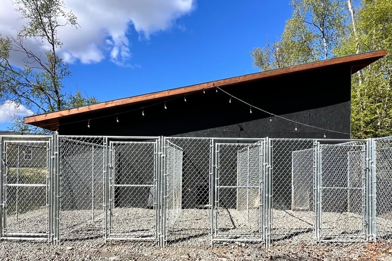 While our dogs enjoy spending their lives out with us, we do provide them with a large, heated indoor/outdoor kennel, equipped with a full grooming facility. When out of the kennel, they enjoy the "elbow room" of our yard & pristine 20 acres of Alaskan Paradise!